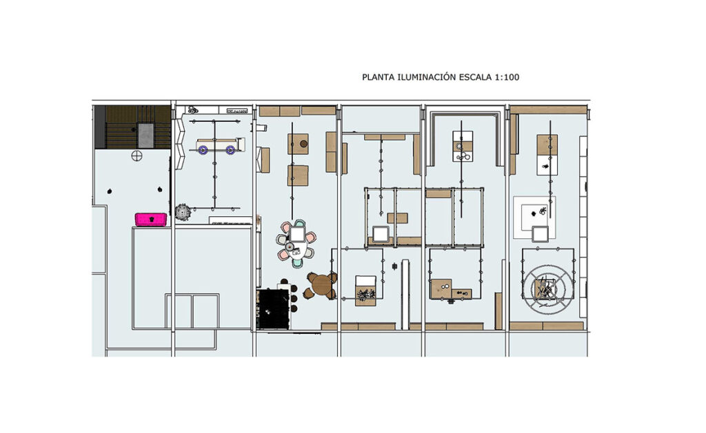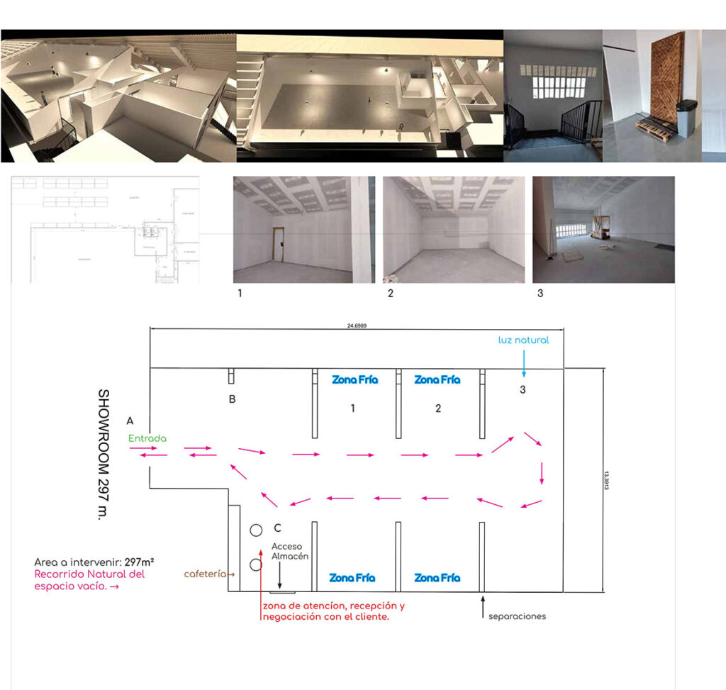 Se considera a priori que el espacio ha de tener habilitadas 2 o 3 zonas para (3) colecciones, que variarán en el tiempo. Y que no se expondrán de forma seriada, sino tendrán un visual decorativo y llamativo, con 3 ambientes diferenciados.