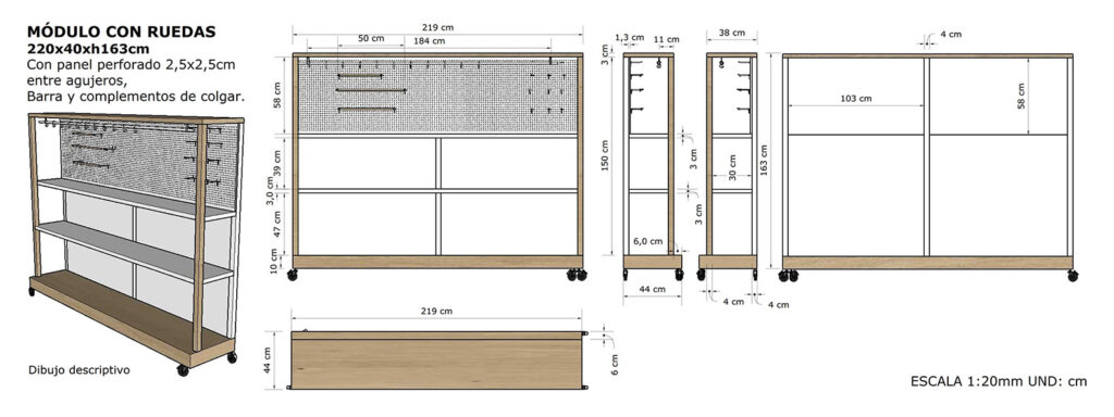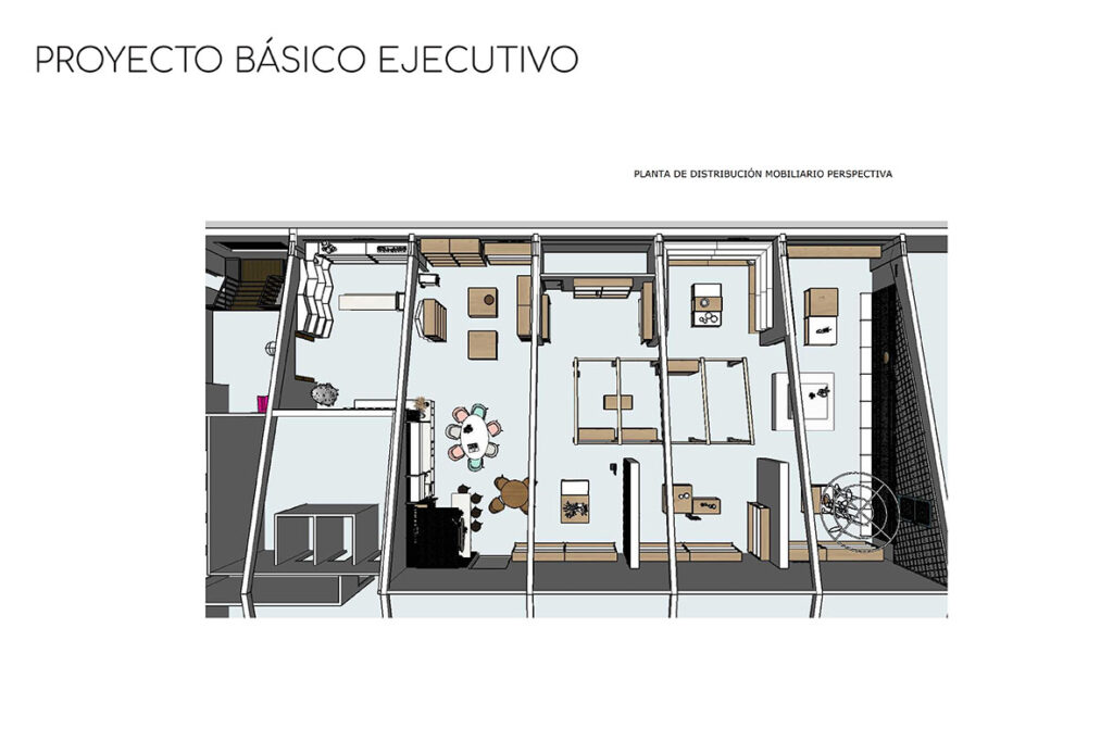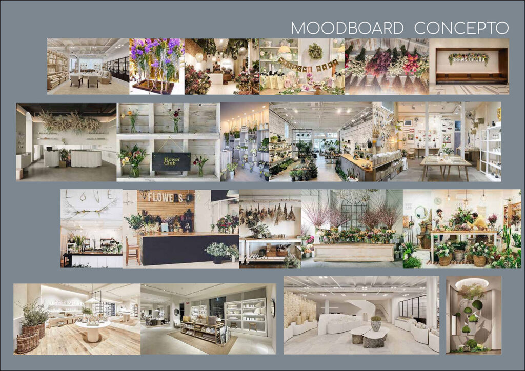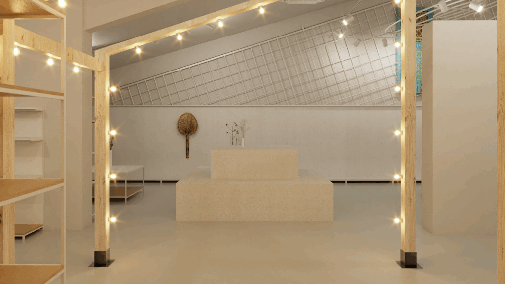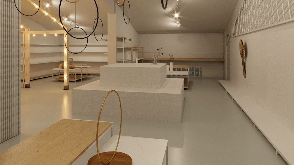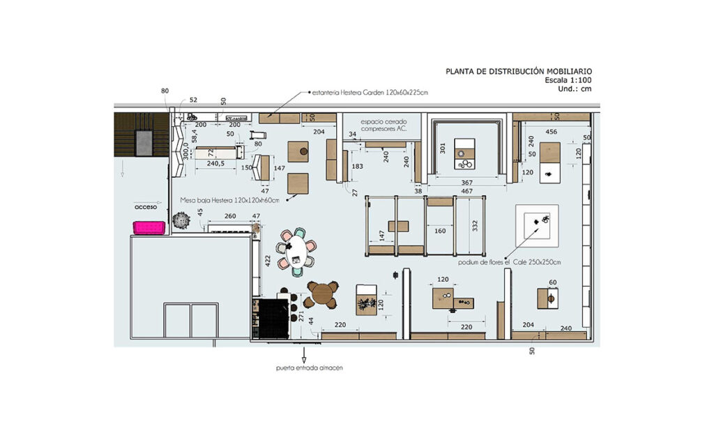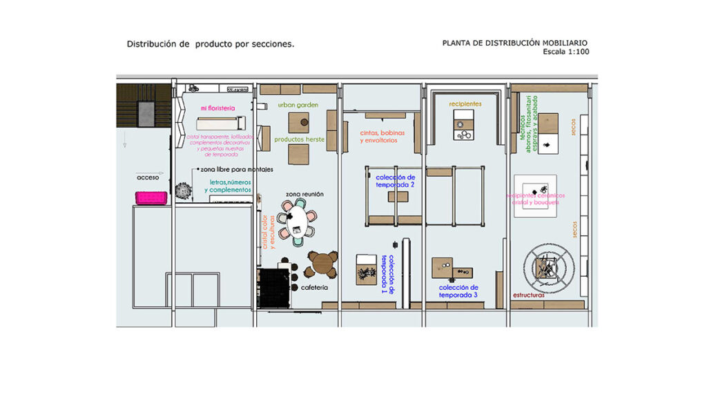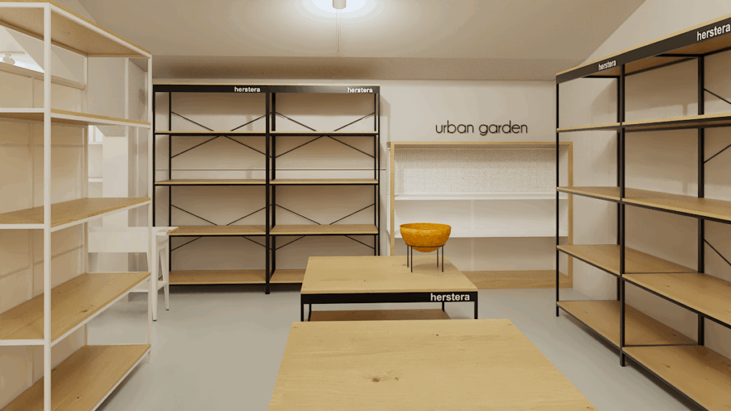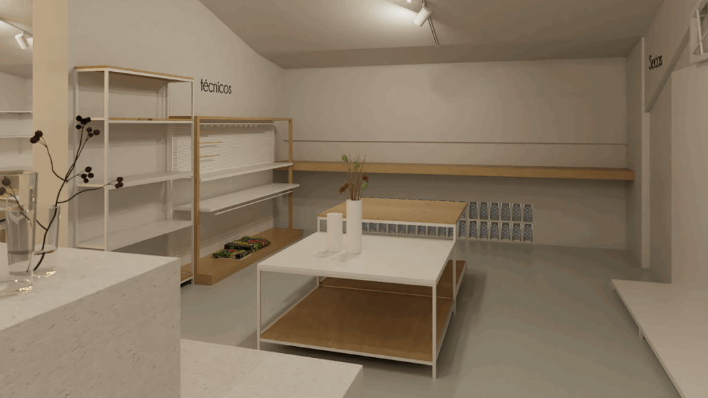 Se diseña el mobiliario por zonas pensando en el producto y su exposición. Mesas, estanterías, soportes etc. Teniendo en cuenta que han de ser movibles en las zonas de colección temporal. Contamos con mobiliario ya disponible para la zona urban garden donde se exhibe producto de una marca concreta, Además con soporte de cubo piramidal que ya utiliza la empresa para ferias y muestras.