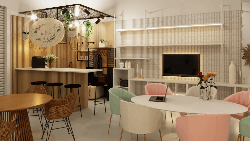 Además el espacio ha de contar con una pequeña cafetería, para atención y obsequio al cliente, donde se preste a pequeñas reuniones y ambiente adecuado para concretar y cerrar las ventas. En definitiva el showroom ha de estar totalmente enfocado en su función que es mostrar y vender su marca , ha de ser versátil para una buena experiencia del cliente. (Se organizarán actividades como cursos, talleres y charlas).
