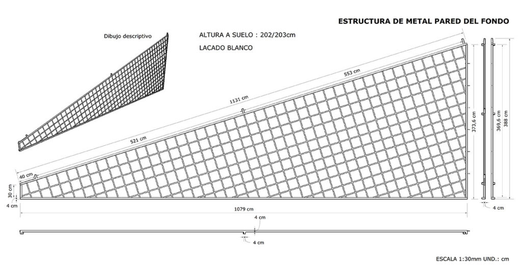 Se diseña una pérgola con la forma inclinada del techo del espacio que haga de marco de una colección central y sirva al mismo tiempo de pasillo enlace a las diferentes zonas expositivas.